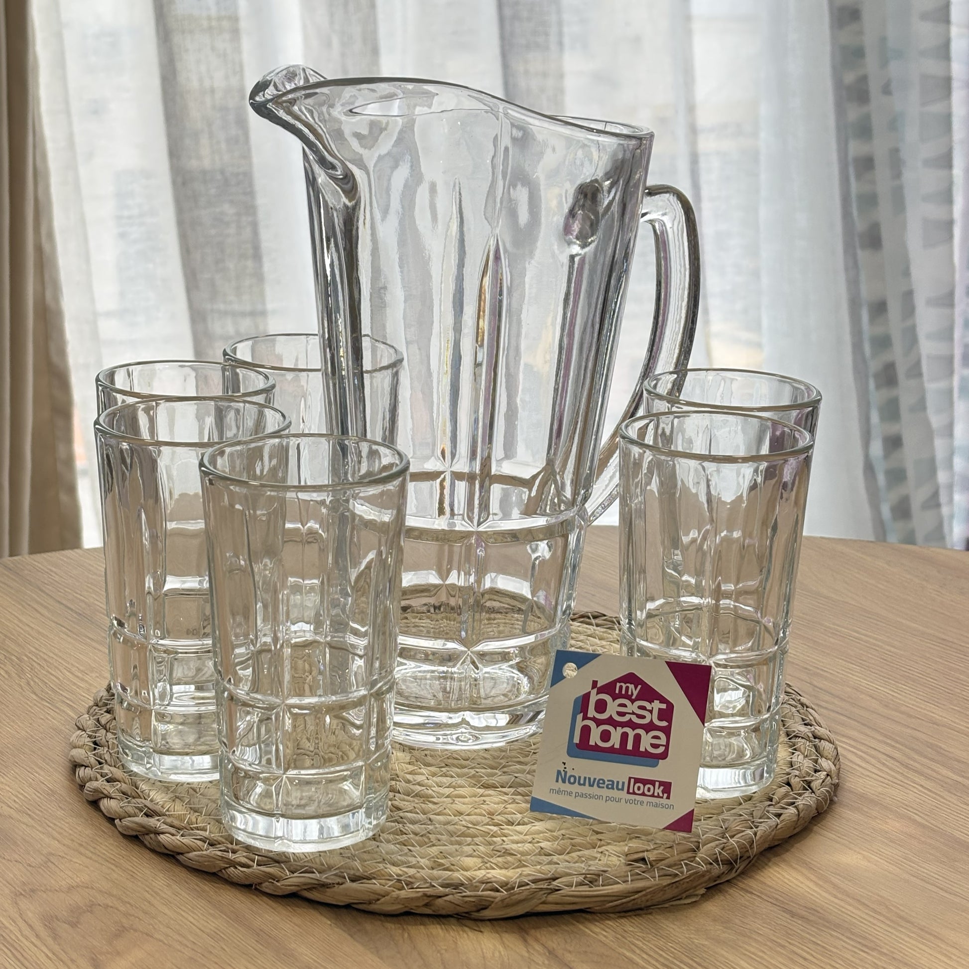 La carafe grande capacité permet de servir facilement de l’eau, des jus ou des boissons fraîches, tandis que les verres assortis offrent une présentation harmonieuse et moderne. Parfait pour les repas en famille, dîners entre amis ou occasions spéciales.